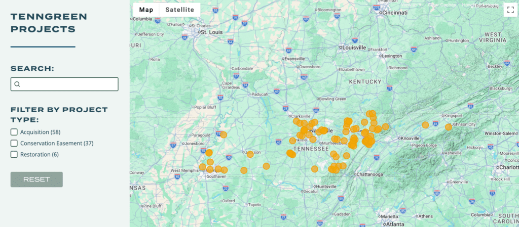 This map displays conservation projects, with data stored in a custom post type in WordPress. The map features live search and filtering, and data points click to open a preview panel, clickable to the individual project page. (The map is not interactive on this page, because the data is owned by the client organization! Click through to the TennGreen website to interact with the map.)
